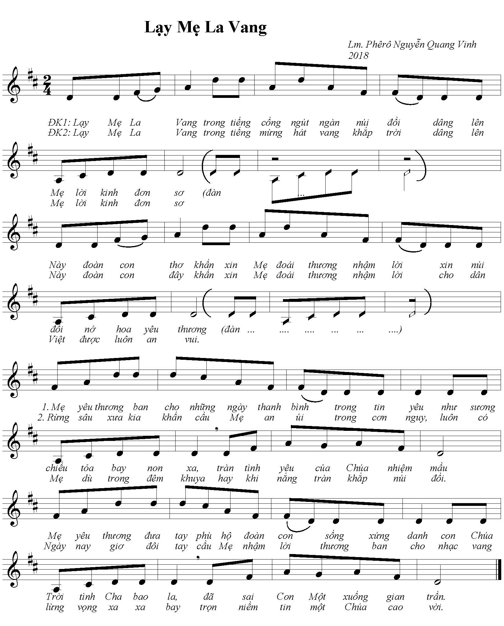 Nhận xét về bài Mẹ La Vang, ... của nhạc sĩ Trần Ngọc Khánh, Thụy SĩKính cha Vinh, Bài Lạy Mẹ La Vang hay quá. Đàn lên là thấy núi rừng Tây Nguyên trập trùng rồi.Hiện nay, bên Khánh đây vẫn còn dư chấn của Covid, làm hạn chế các sinh hoạt, trong đó có các buổi tập hát ca đoàn. Do đó không tập thêm các bài hát mới được. Hy vọng mau trở lại bình thường. Vào các dịp lễ Đức Mẹ, Tháng Hoa chẳng hạn, bài hát "Mẹ La Vang" rất hợp, sẽ được vang lên. |